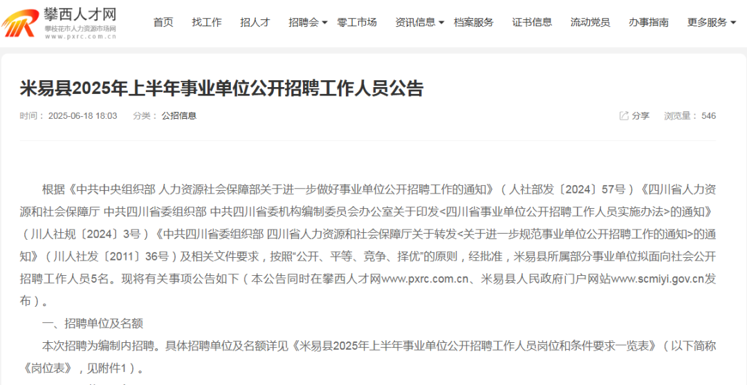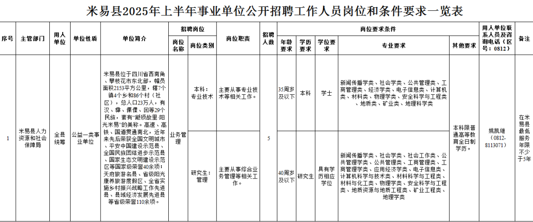 攀枝花市米易县25上半年事业单位招聘公告