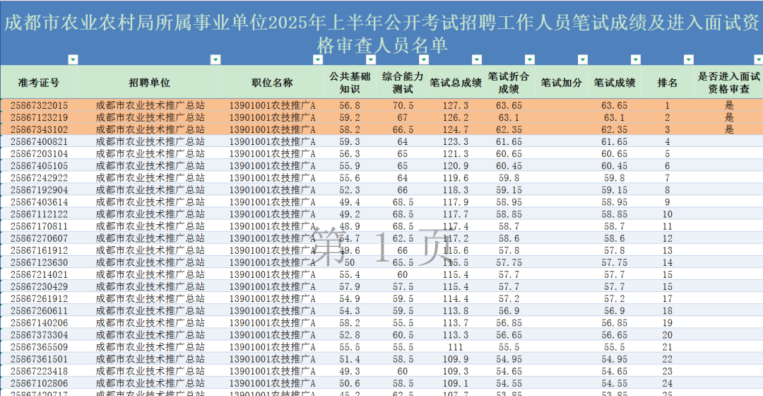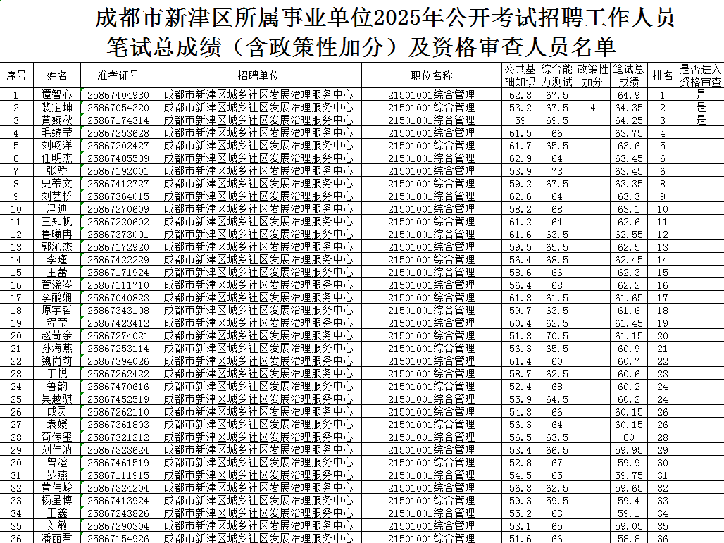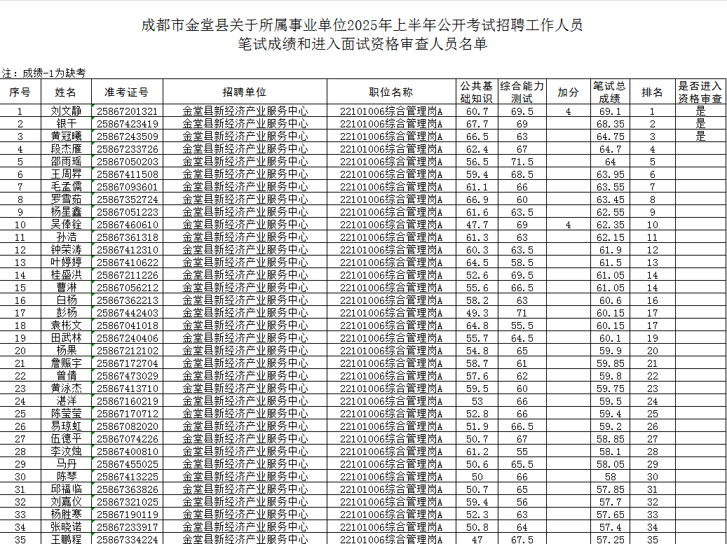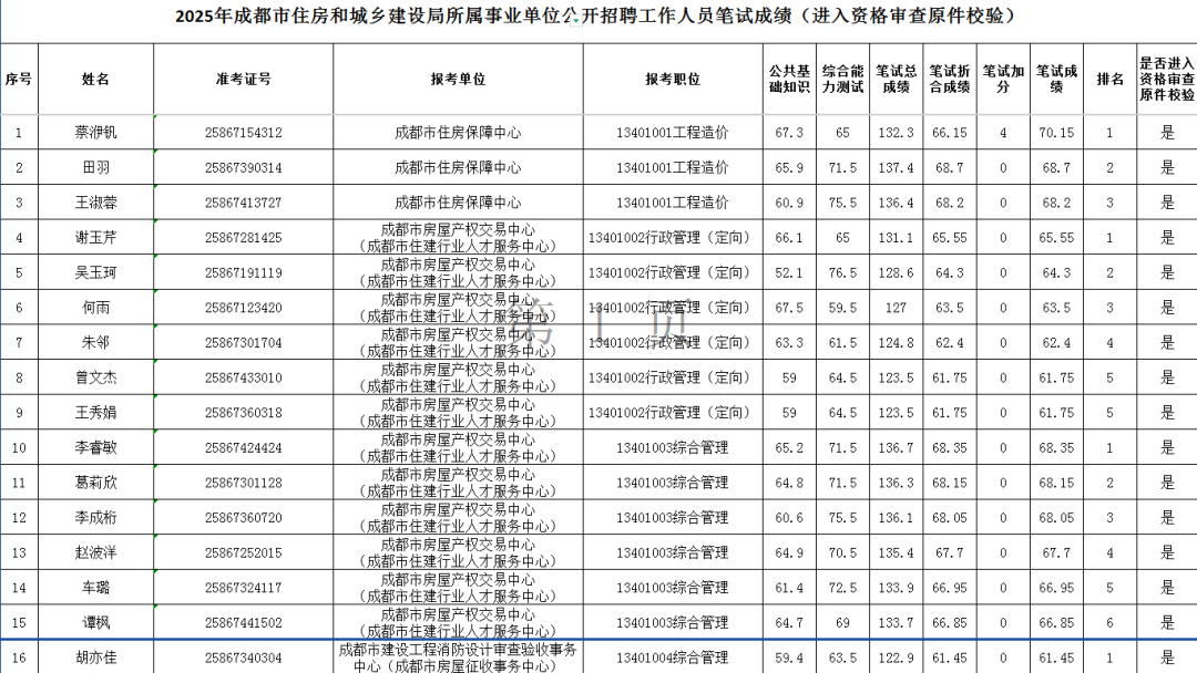 剩余成都区县单位事业单位笔试进面名单