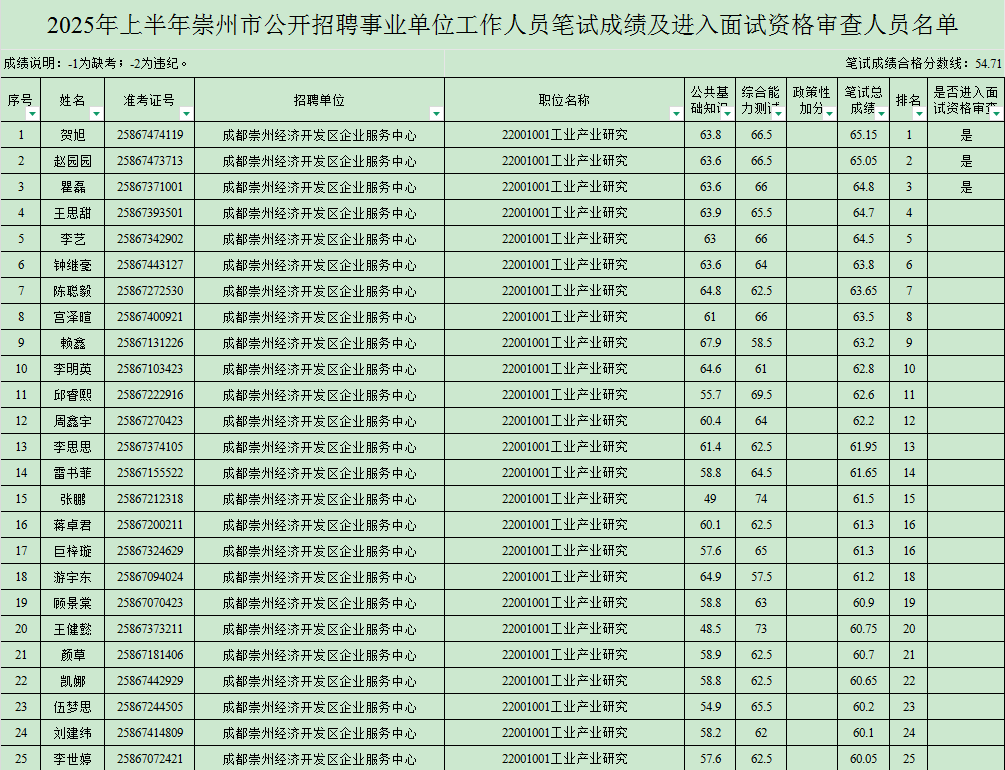 资格审查不合格或逾期未参加面试资格审查的,不能进入面试,由此产生的空额按照该岗位笔试*从高分到低分依次等额递补1次。递补进入资格审查人员名单将于2025年7月1日19:00前在成都市新津区人民政府门户网站公布,递补拟于2025年7月2日进行,请相关人员注意查询自己是否递补进入资格审查,并提前做好准备。